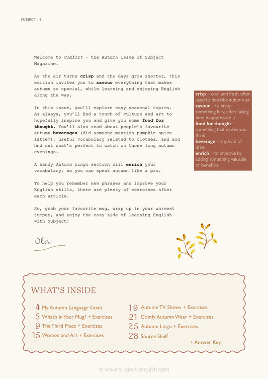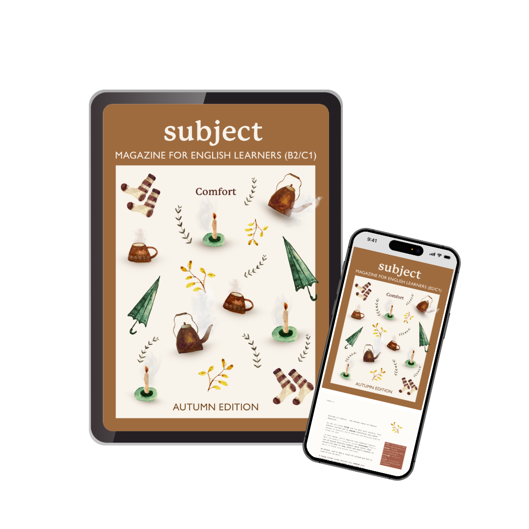 Kolekcja tekstów z wyjaśnionym zaawansowanym słownictwem, dzięki czemu możesz z przyjemnością czytać po angielsku bez ciągłego zaglądania w słownik. Do tego ćwiczenia, aby wiedza została z tobą na dłużej. W najnowszym numerze Comfort ucz się zaawansowanego angielskiego z idealnymi jesieniarskimi tematami 🍂